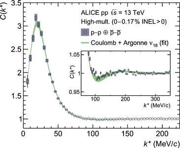 We started our journey towards a better understanding of these hyperon-nucleon interactions in 2016, by using p+p, p+A reactions at different energies (GeV at the HADES experiment and TeV at the ALICE experiment). The measurements of p-p pairs have been used within our group to build a data-driven model for the emitting source. An example of a measured p-p correlation with ALICE is shown in the figure on the left.