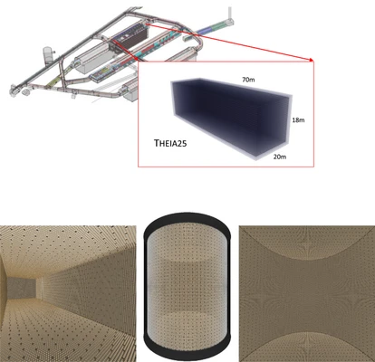 THEIA could reside in a cavern the size and shape of those planned for the Deep Underground Neutrino Experiment (DUNE), called Theia-25, and a larger 100-kton version (Theia-100) that could achieve an even broader and more sensitive scientific program (Fig. 1). THEIA is expected to allow for new scientific discovery across a broad spectrum of physics, including long baseline neutrino measurements of oscillations and CP violation searches, solar neutrino measurements of unprecedented precision and scope, and the potential to extend the reach of neutrinoless double beta decay searches to the mass scales implied by a Normal Ordering of neutrino masses. In addition, THEIA represents a major step forward for advancement in other fields – ranging from detection of the Diffuse Supernova Background flux to a measurement of geo-neutrinos with unprecedented statistics.