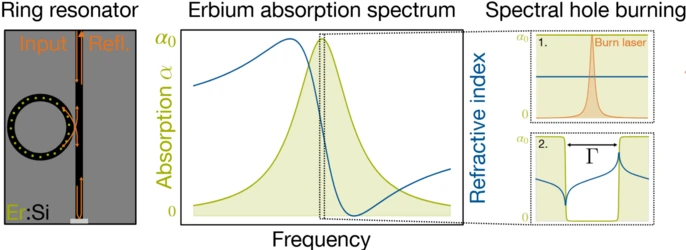 Our second approach is based on the inherent frequency stability of erbium dopants under optimized conditions. In particular, we focus on a nanophotonic approach, in which dopant ensembles are embedded into on-chip silicon resonators. As shown in Fig. 3, by tailoring the optical absorption of the dopants, the group velocity of light can be reduced by many orders of magnitude. This reduces the resonator linewidth and can thus improve the precision of laser stabilization [4]. This makes our chip-based approach an interesting candidate for highly compact and stable frequency references.